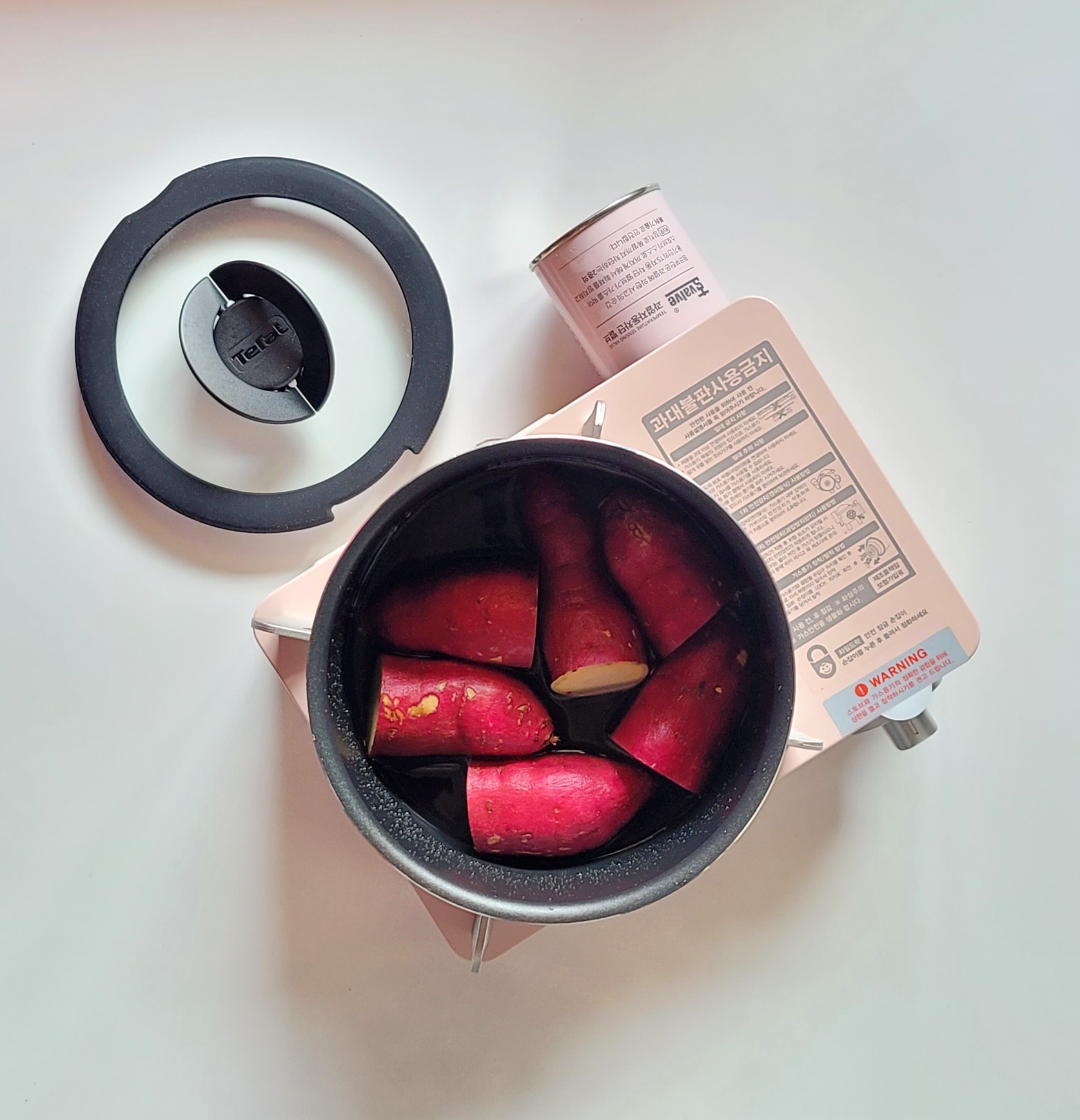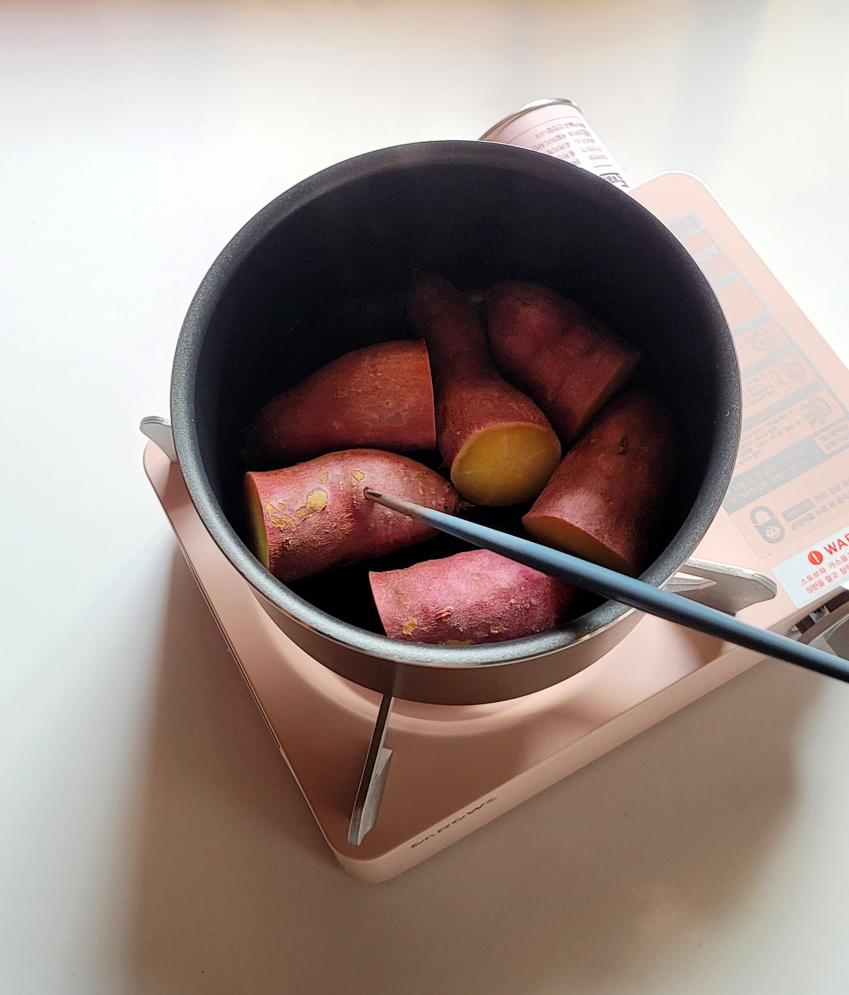 10분 중불에 고구마 삶기 - 10분 정도 삶아준 뒤 뚜껑을 열어서 젓가락으로 익었는지 확인해 주세요. 물이 많이 남아있으면 조금만 남기고 버려주시고 물이 거의 없으면 뚜껑을 덮고 약불로 1~2분 정도 더 삶아주세요.