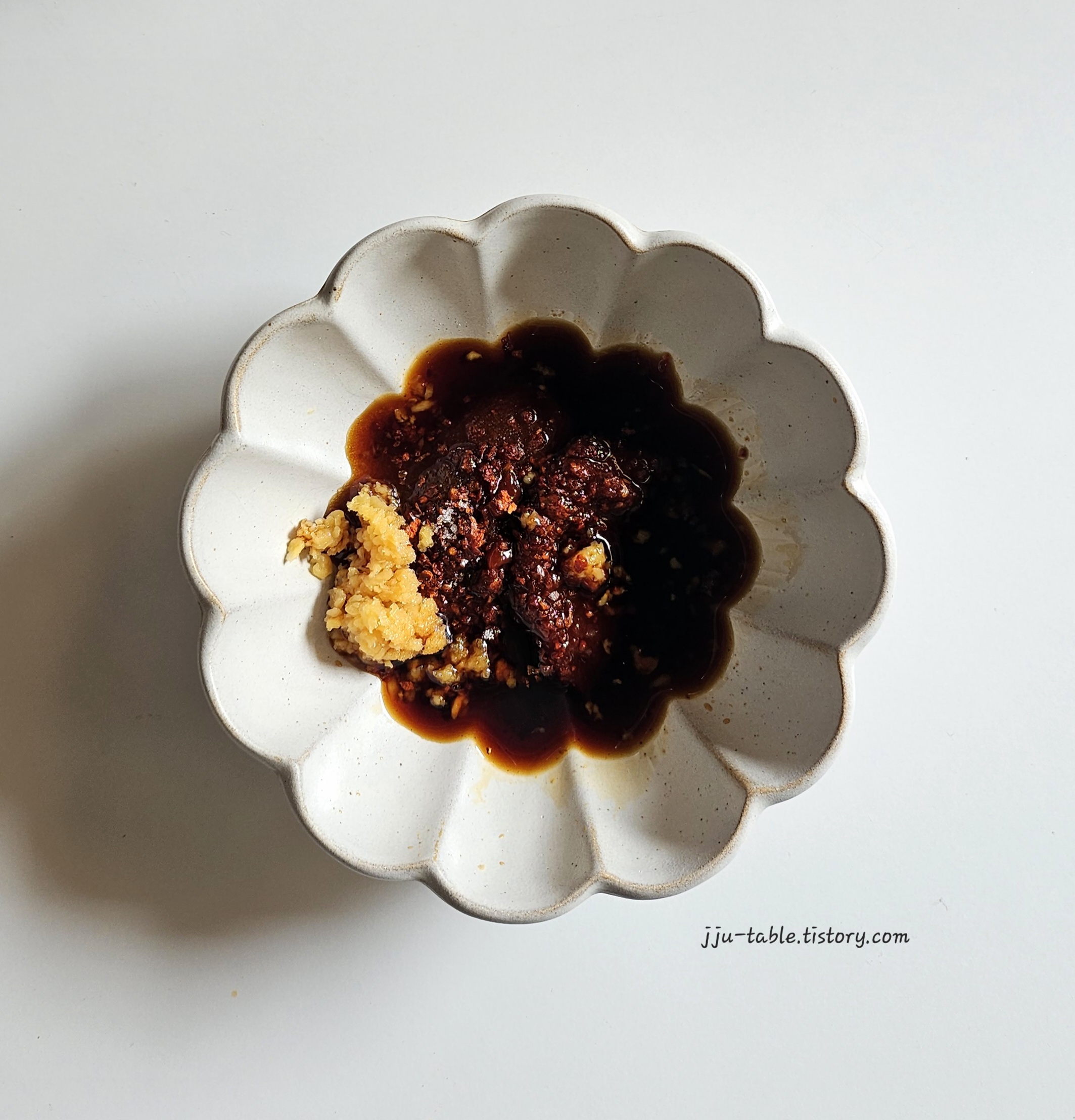 두부 - 두부조림용 양념장을 만들어 볼게요. 밥 숟가락 기준으로 고추장 1 스푼, 고춧가루 1 스푼, 설탕 1/2 스푼 올리고당 1/2 스푼, 다진 마늘 1/2 스푼 넣어주세요. 올리고당 대신 설탕으로 하셔도 돼요. 달달한 맛을 좋아하시면 설탕이나 올리고당을 더 추가해 주시면 돼요. 후춧가루를 추가해 주셔도 좋아요.