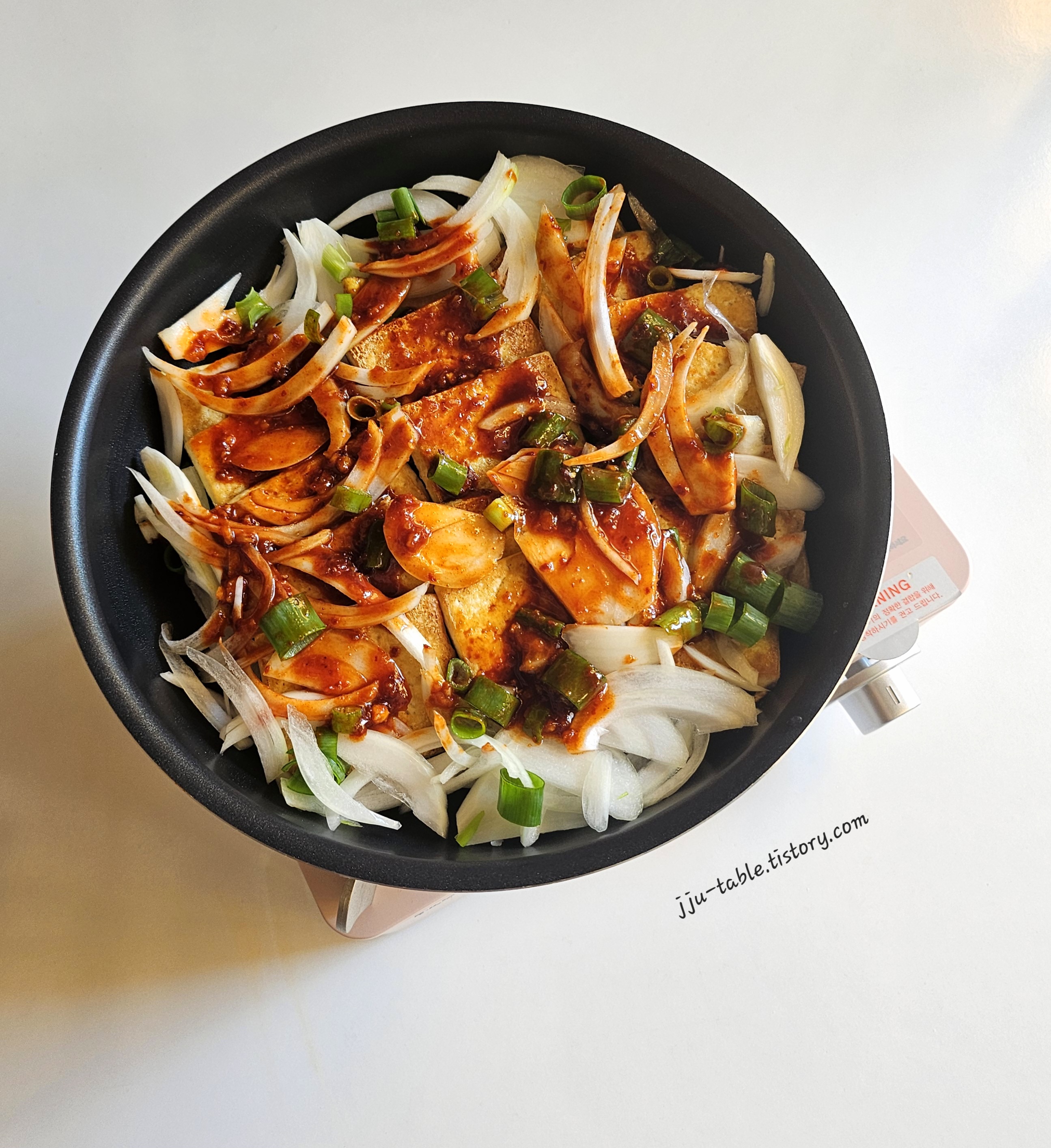- 두부 한 모, 양파, 대파, 간장, 고추장, 고춧가루, 올리고당, 설탕, 다진 마늘, 멸치 육수, 통깨, 쪽파