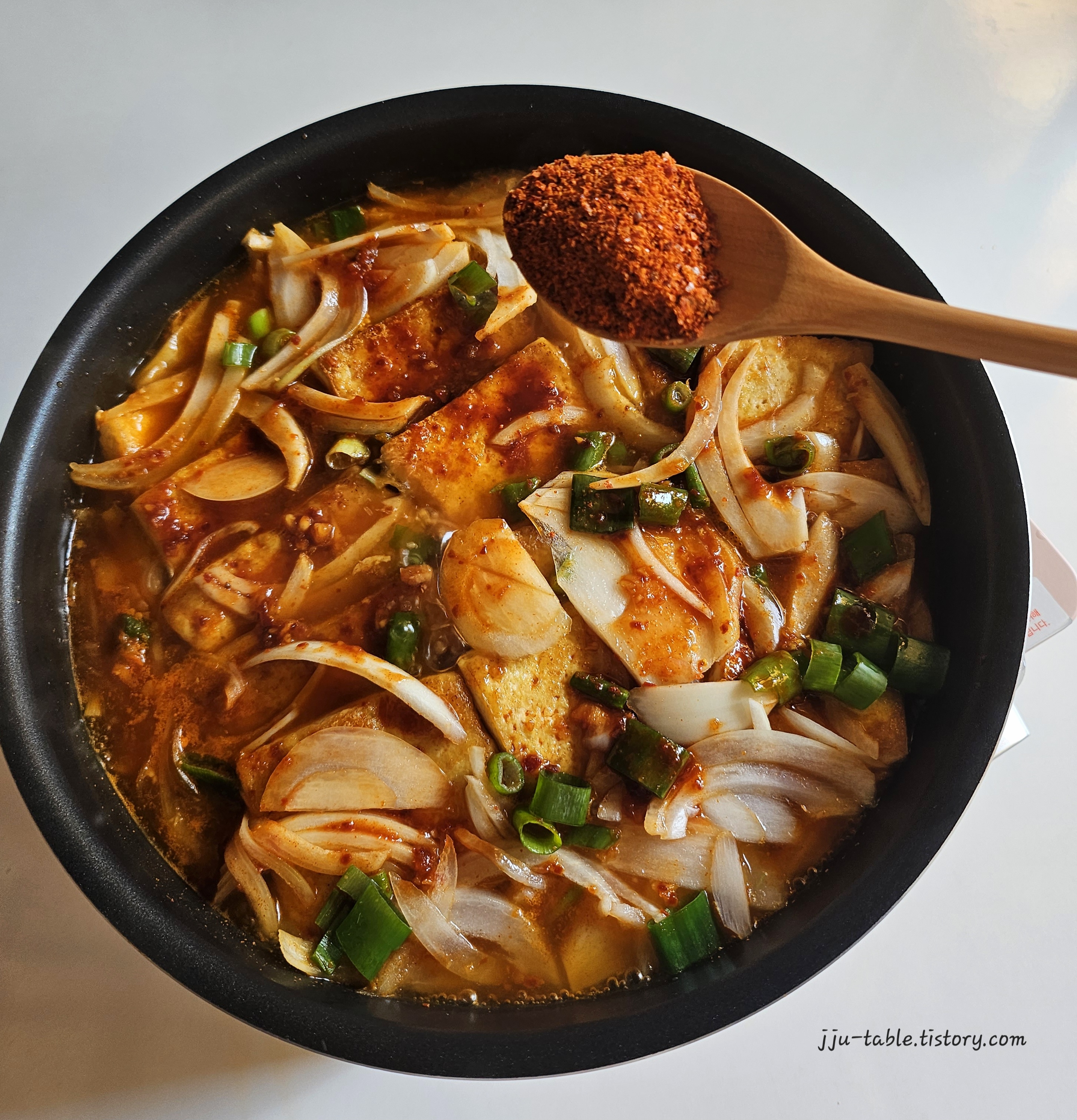 고춧가루 1 스푼 더 넣기 - 센 불로 끓이고 끓으면 중 약불로 낮추어주세요. 중간중간 양념을 숟가락으로 끼얹어주면서 두부에 골고루 양념이 배이게 해 주세요. 중 약불로 한 후 5분~7분 정도 조려주시면 돼요. 국물의 양을 보면서 시간을 조절해 주시면 됩니다.