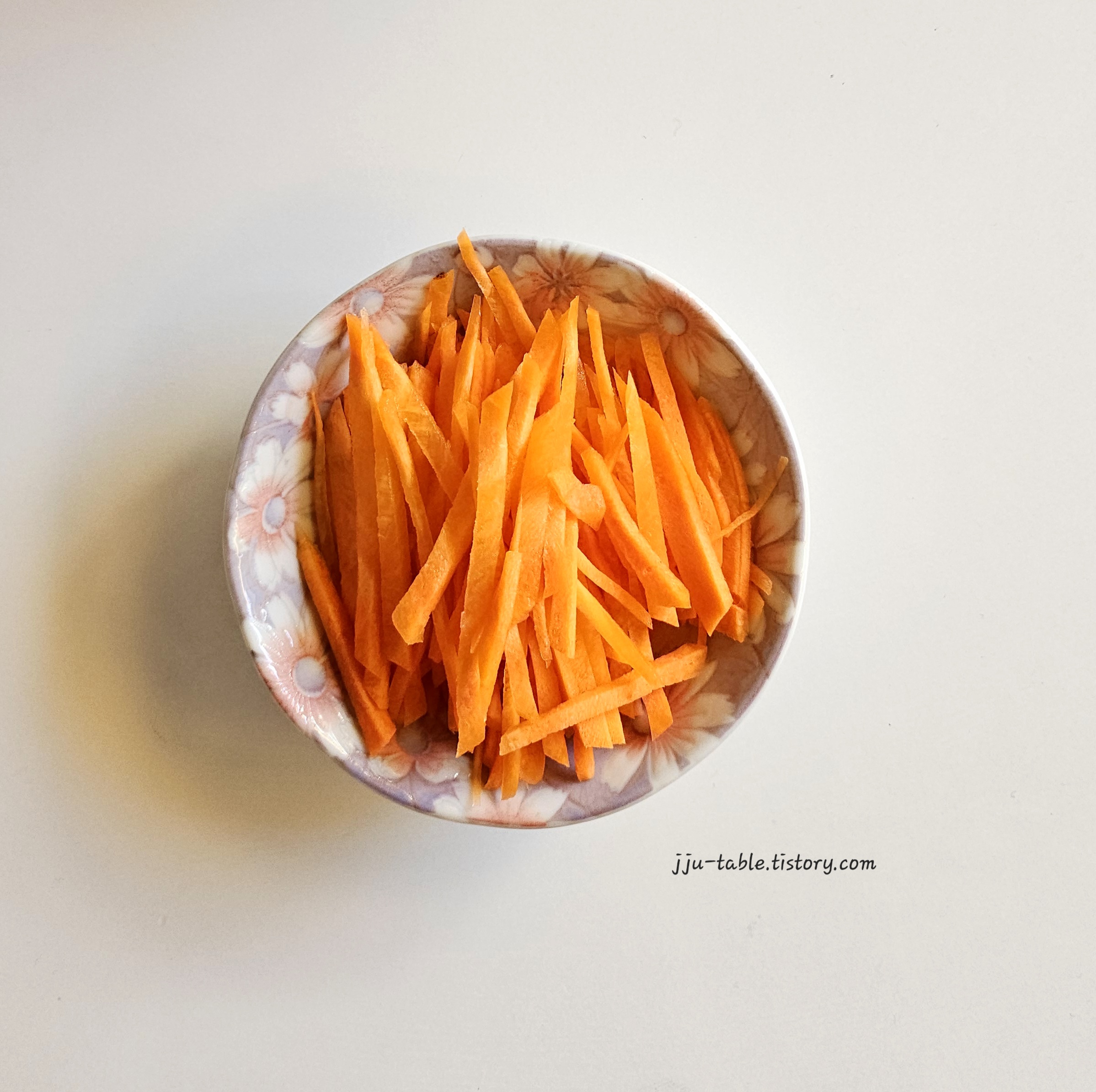 당근 채 썰어서 준비하기 - 다시마를 찬물에 불려서 다시마 우린 물을 만들어 주세요. 30분 정도 우리시면 돼요.