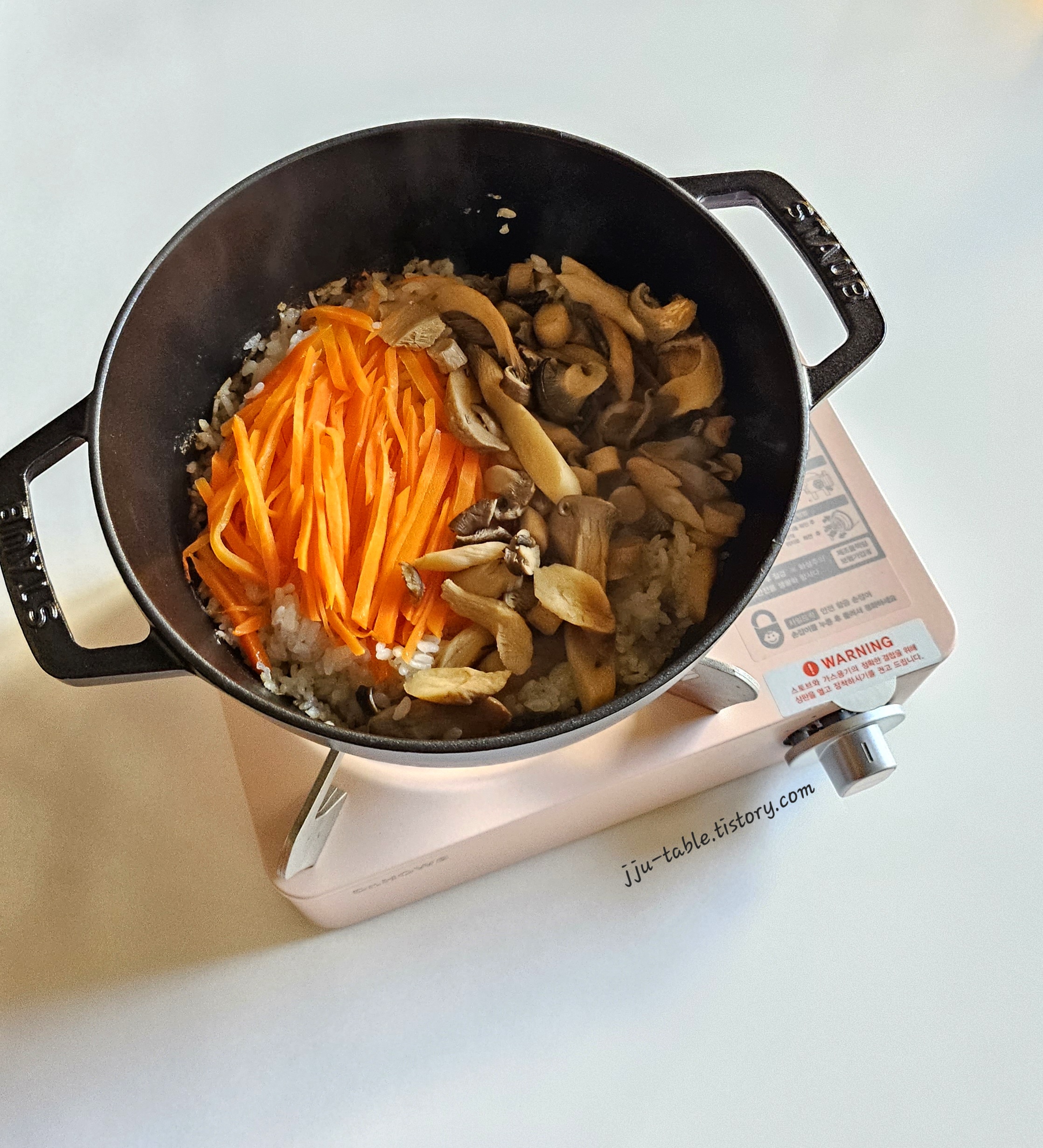 당근과 벗섯 넣기 - 뚜껑을 닫고 중 약불로 10분 정도 끓여주시고 5분 뜸 들여주세요.
