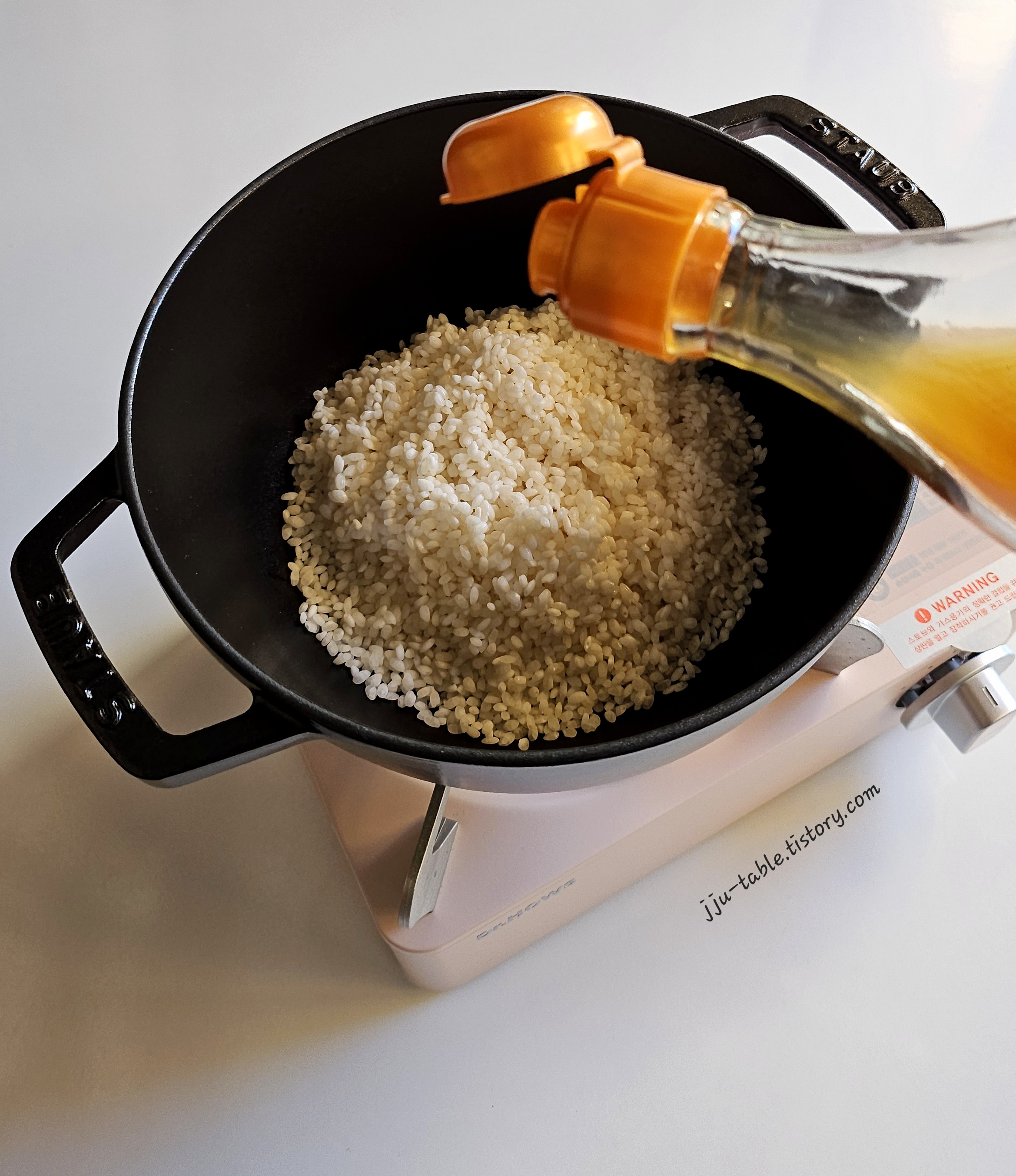 불린 버섯 밑간하기 - 스타우브 냄비에 불린 쌀을 넣고 참기름 2 스푼정도 넣고 쌀이 투명 해질 때까지 볶아주세요.