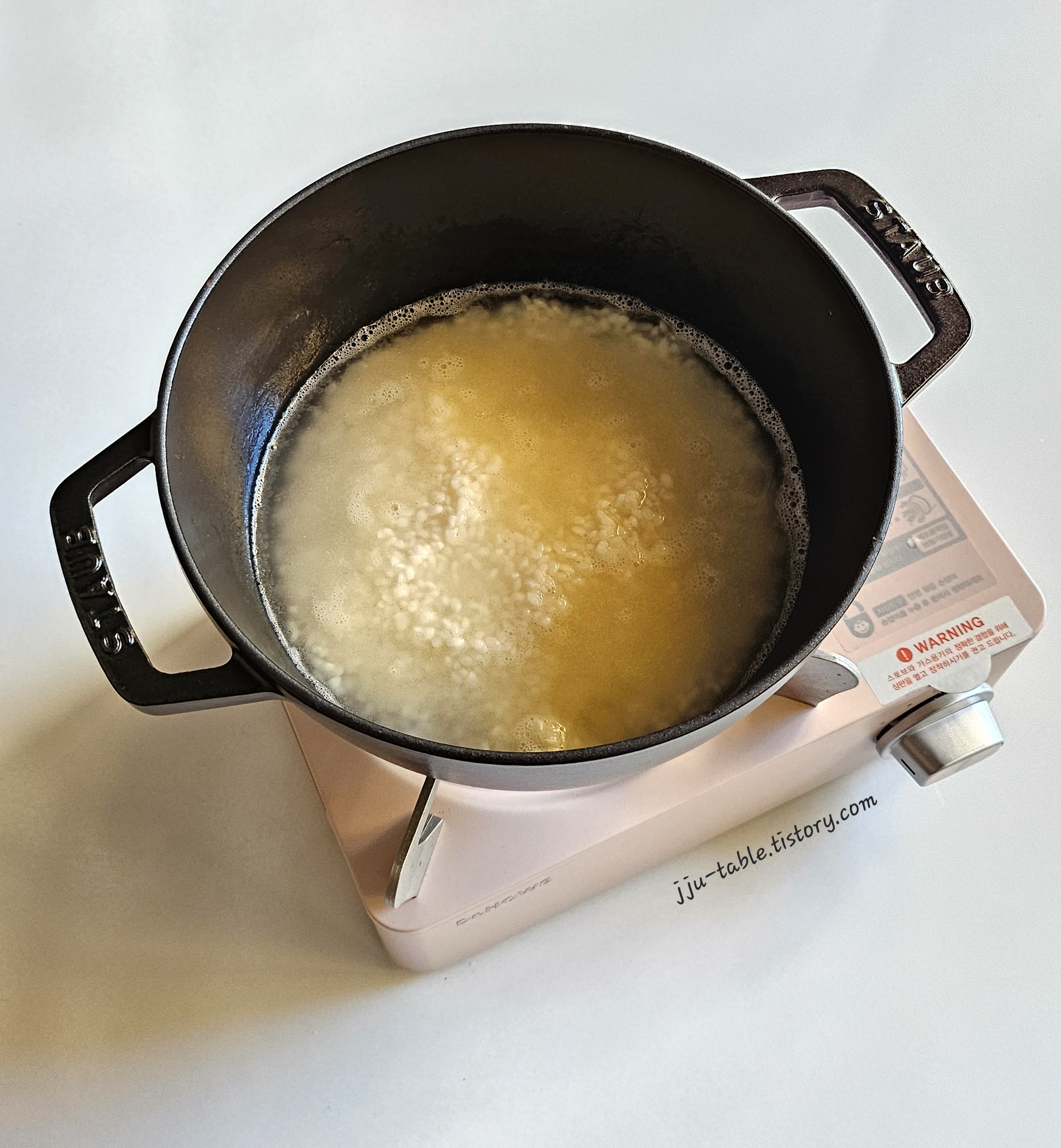 다시마 우린 물 넣기 - 센 불에 끓여서 끓어오르면 한 번 휘저어주세요.