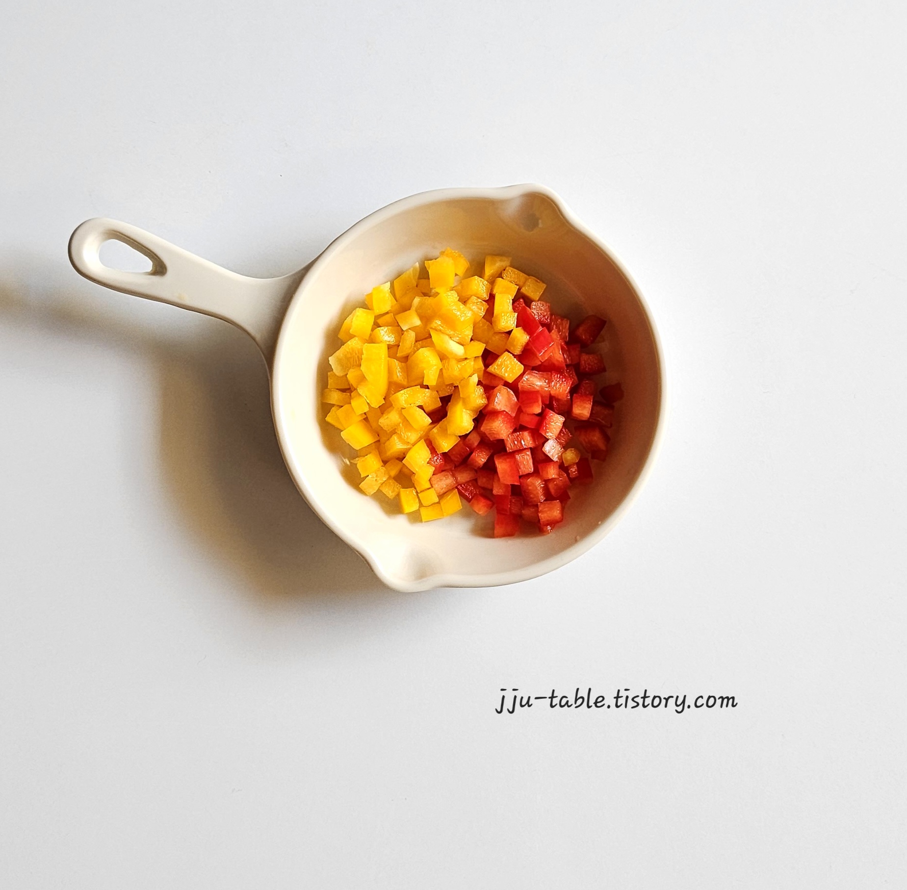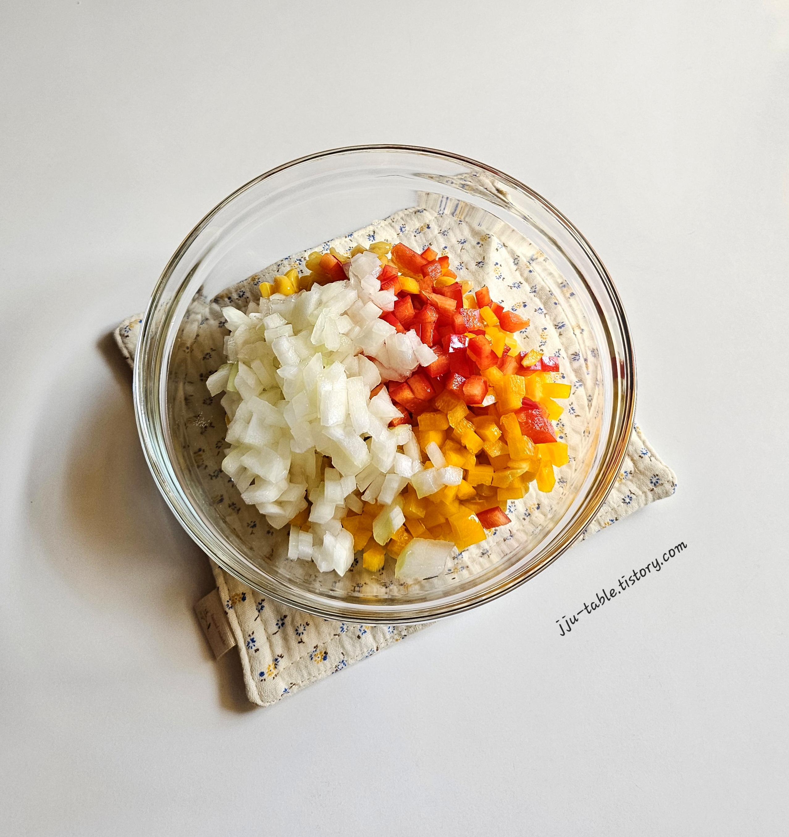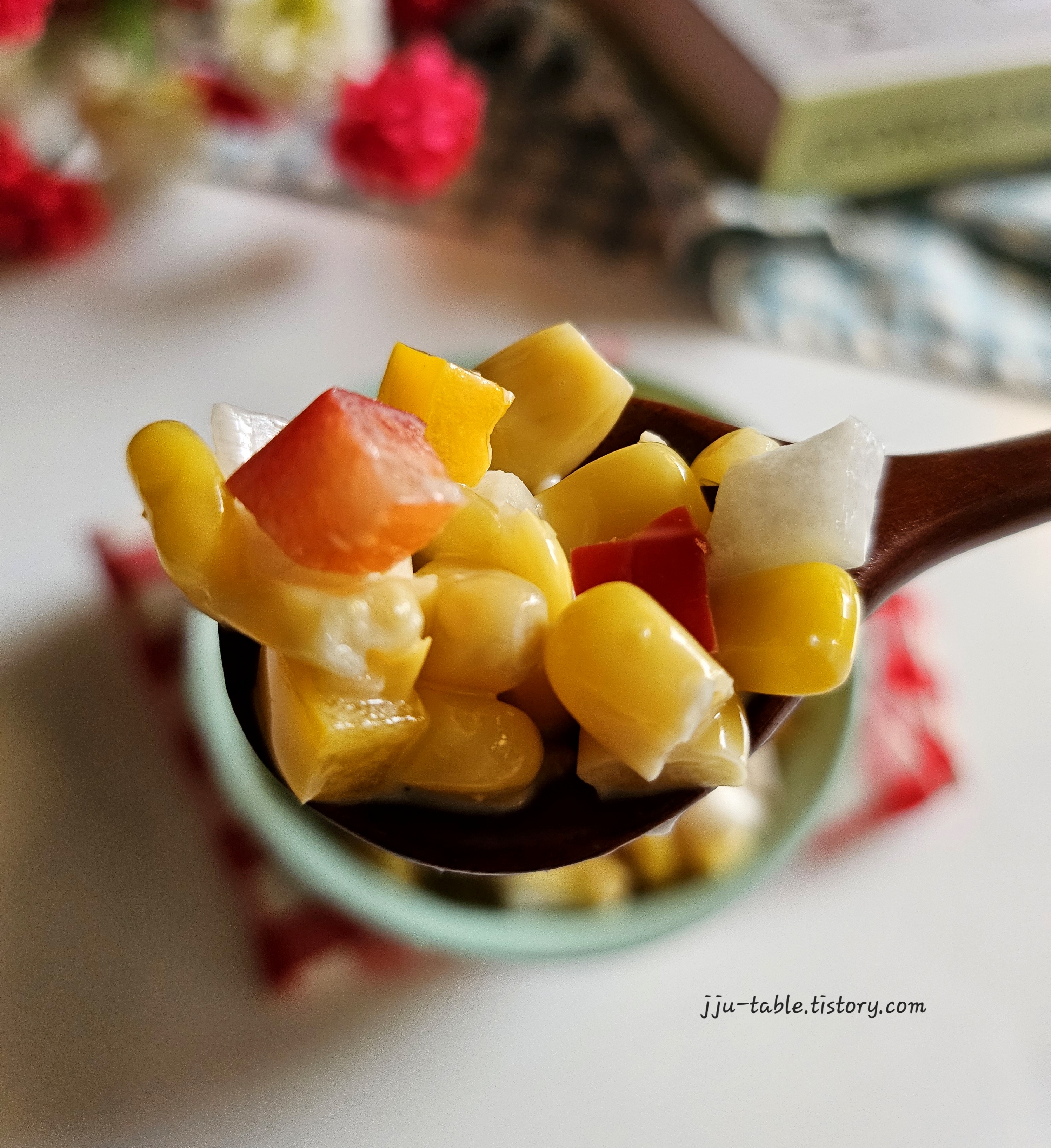 - 콘 옥수수, 빨간 피망, 노랑 피망, 양파, 마요네즈, 설탕, 식초, 소금