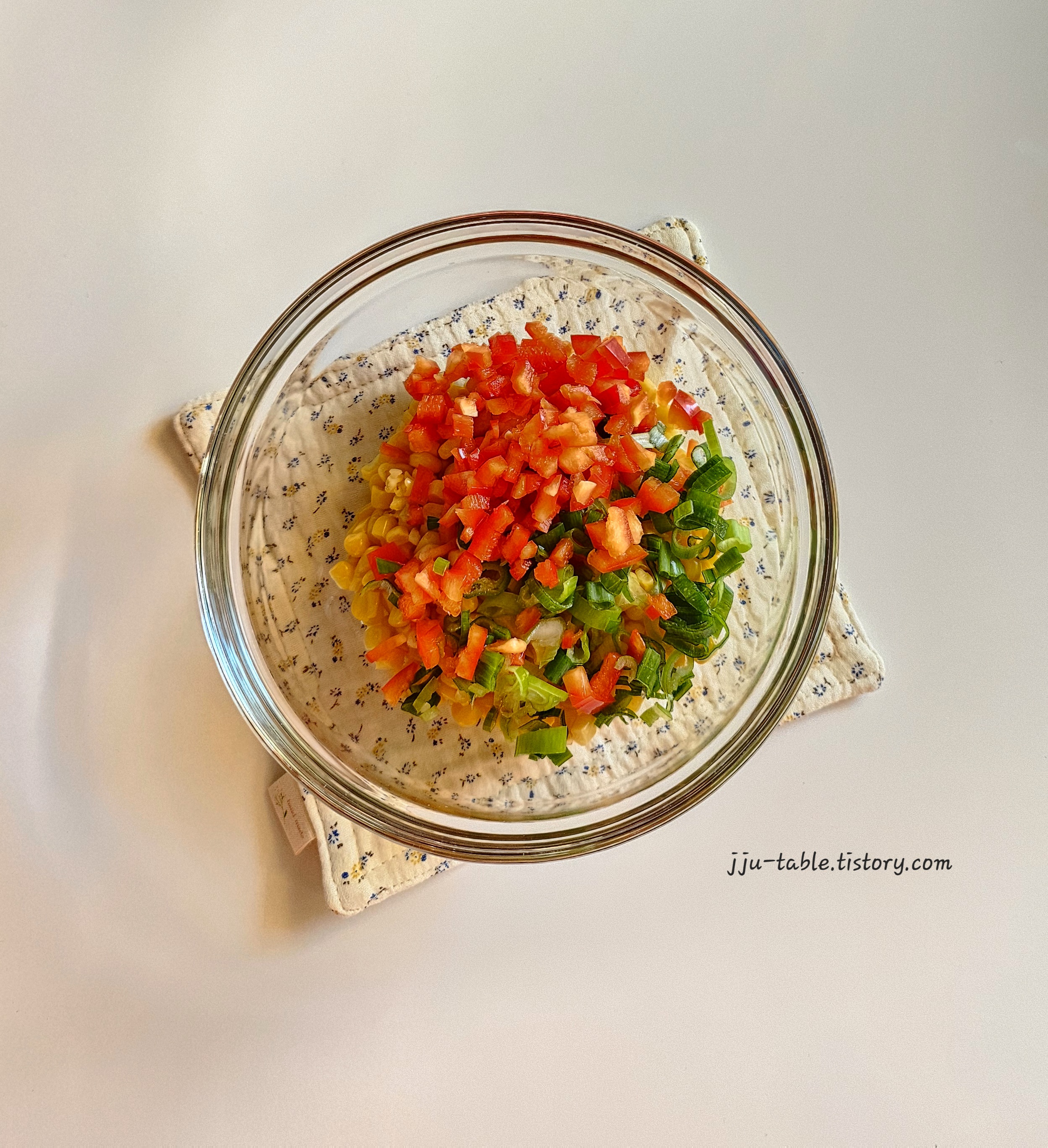 - 캔 옥수수, 피망, 대파, 달걀, 부침가루, 소금