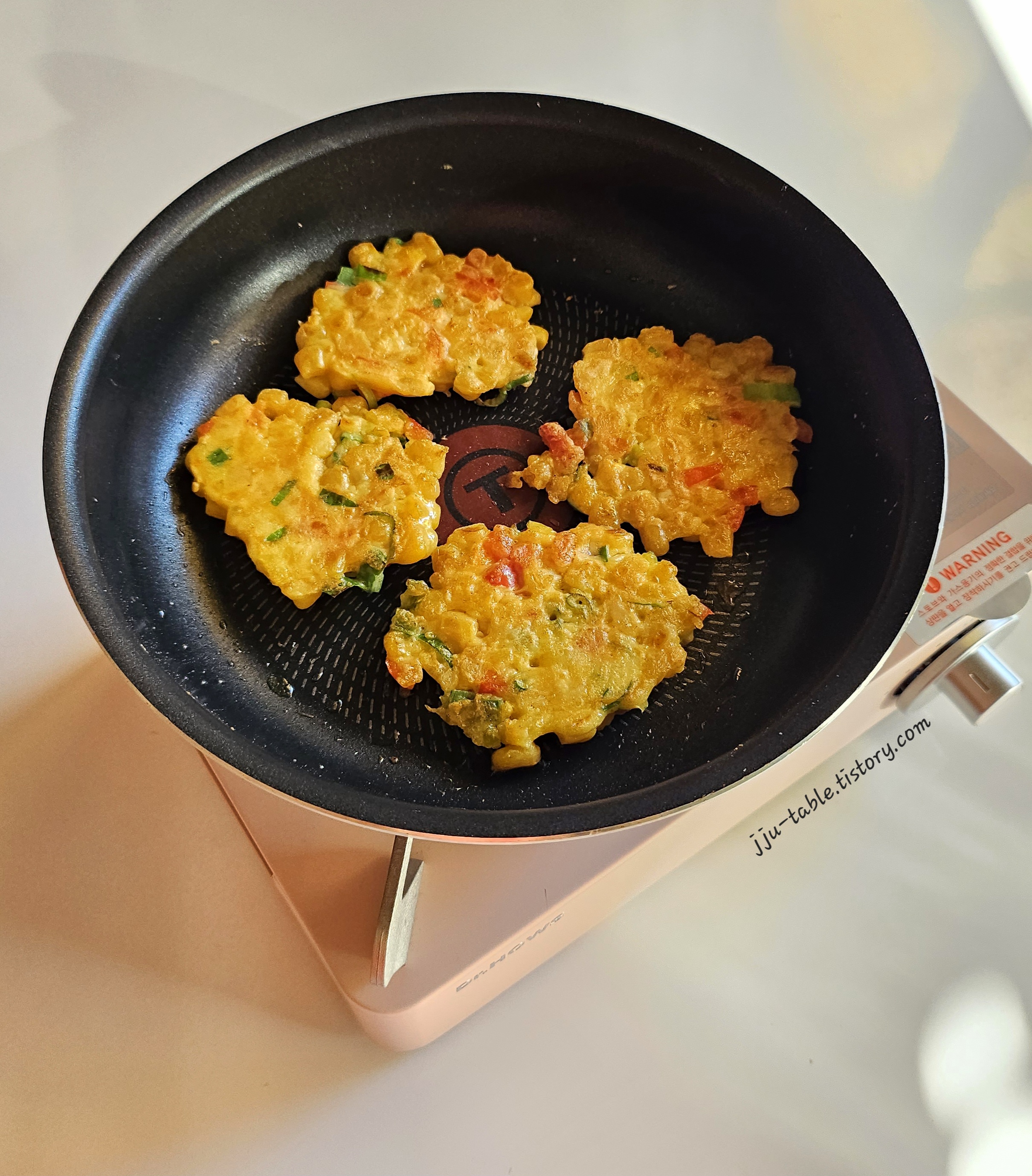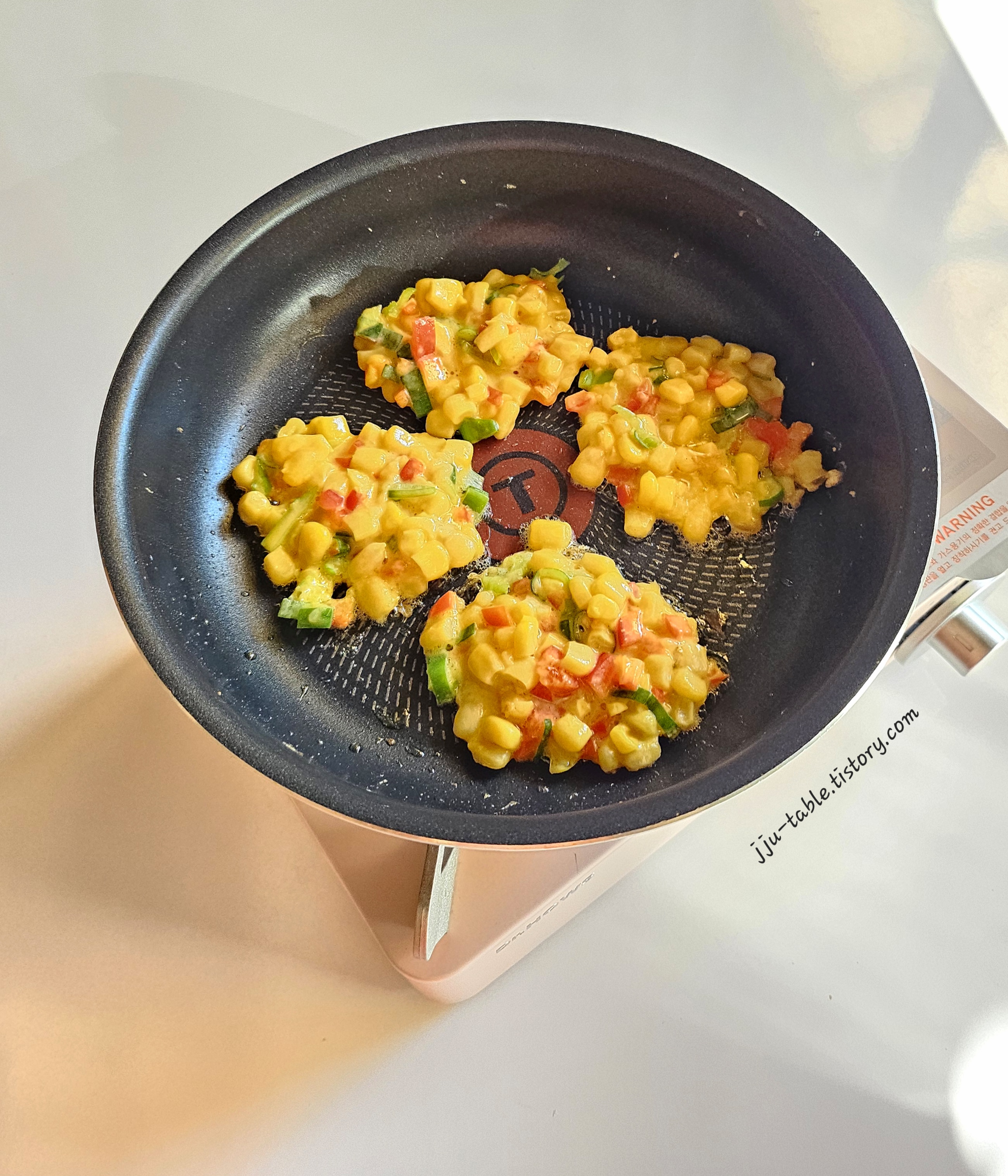 콘옥수수전 - 프라이팬에 오일을 두른 후 밥 숟가락으로 한 숟가락 정도의 양을 프라이팬에 올려주세요.
