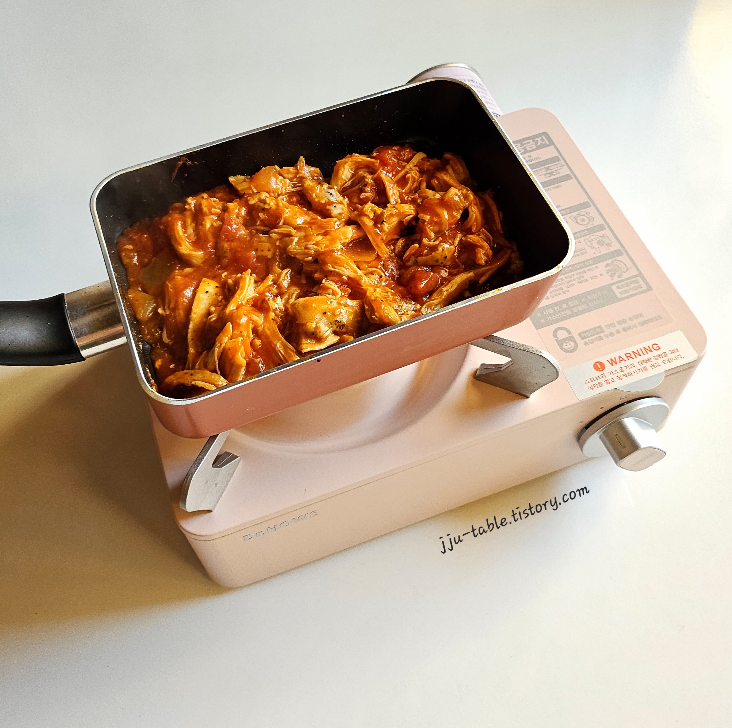 파프리카에 고구마 넣기 - 파스타 소스에 볶은 닭가슴살을 넣어주세요.