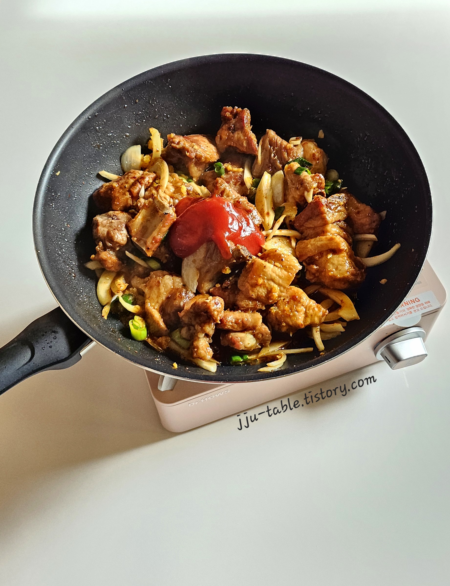 대파, 양파, 다진마늘 3스푼 넣기 - 류수영 돼지갈비찜의 비법 소스는 케첩인데요. 토마토케첩을 2스푼 넣으시고 강불로 뒤적여 주세요. 양파가 숨 죽을 때까지 3분 정도 볶아주세요.