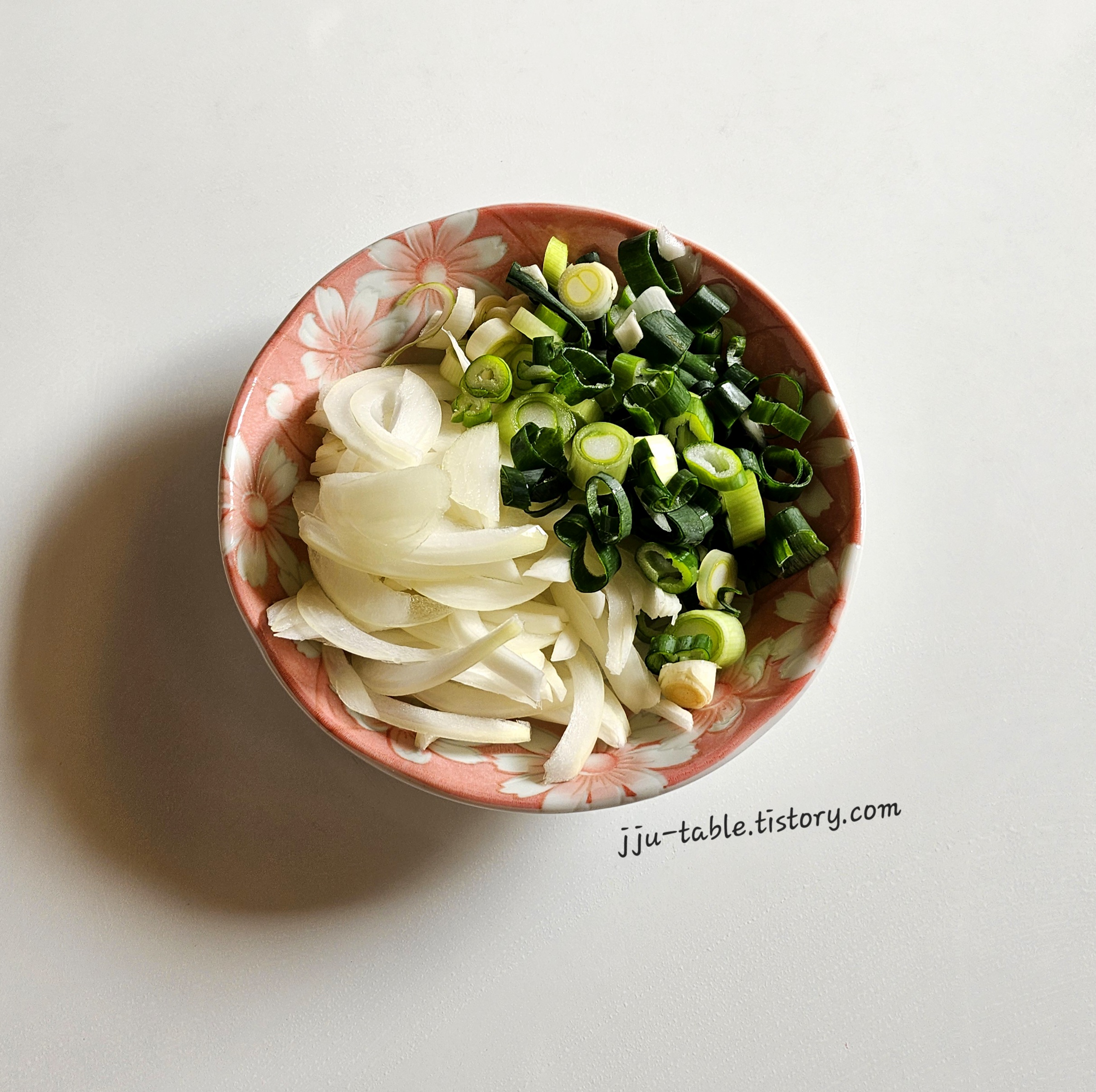 양파 대파 준비하기 - 돼지갈비를 흐르는 물에 1~2번 씻어 주세요. 부유물과 뼈가루를 제거하기 위해서입니다.