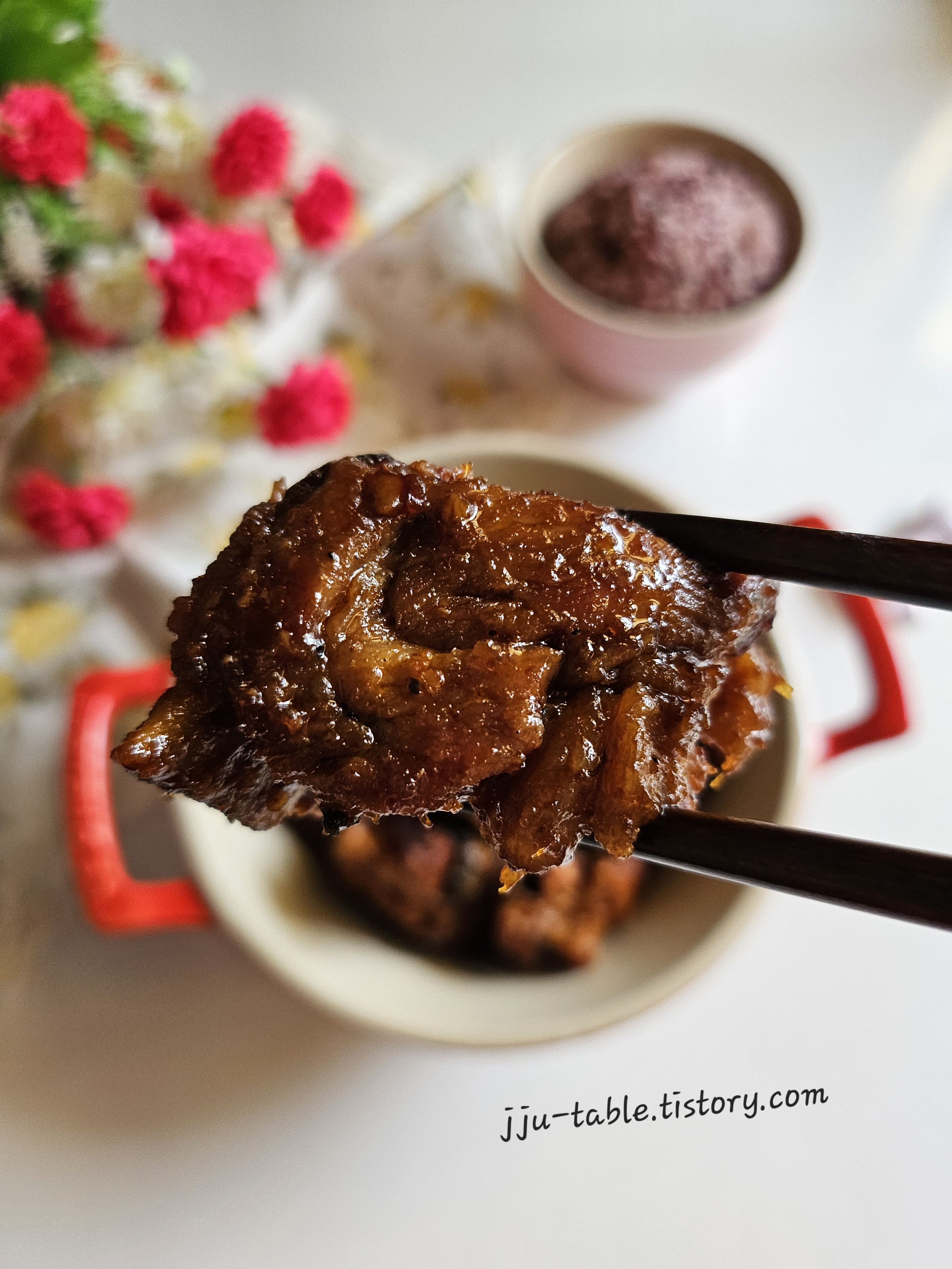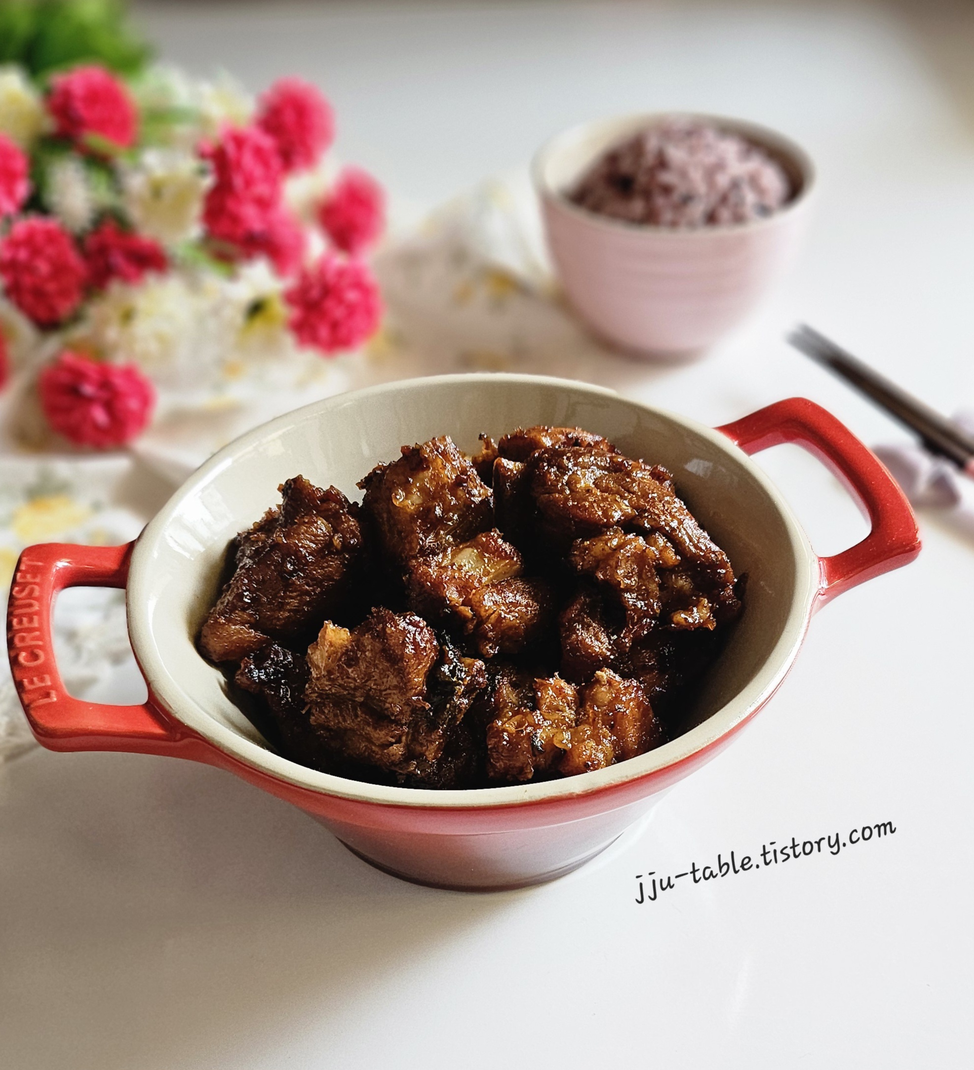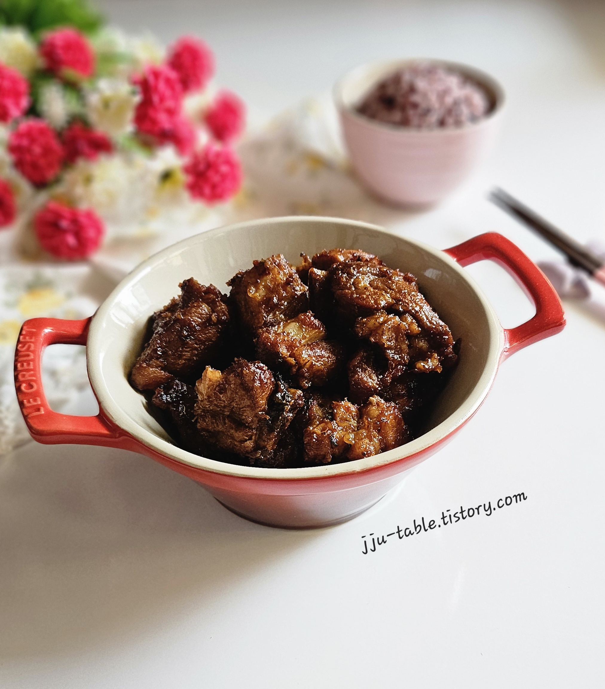류수영 돼지갈비찜 돼지갈비 1kg로 3~4인분양의 돼지갈비찜이 완성이 되었어요. 고춧가루를 넣었는데 저희 집 고춧가루가 맵지 않아서 매운맛은 나지 않고 간장 맛이 나는 돼지갈비찜이었어요. 매콤한 맛으로 드시고 싶으시면 청양고추를 넣어서 드시면 좋을 것 같아요. 역시 믿고 먹는 어남선생 레시피이네요. 밥이랑 먹으니 너무 맛있고 좋네요. 레시피도 간단하고 맛있는 어남선생 돼지갈비찜 레시피!!! 오늘은 류수영 님 돼지갈비찜 어떠세요???