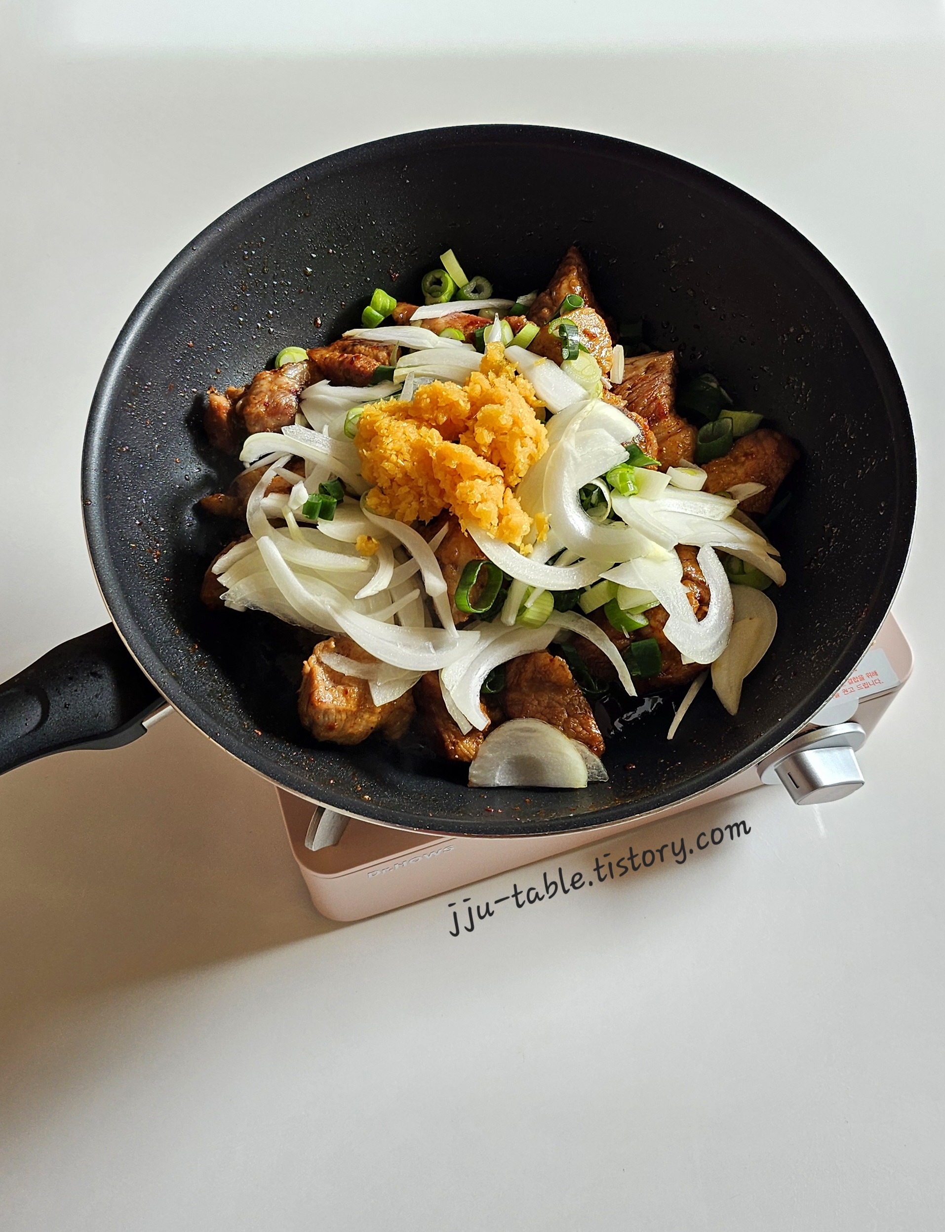 고춧가루 3스푼 넣기 - 대파와 양파를 넣어주시고 다진 마늘 3스푼 넣어주세요.