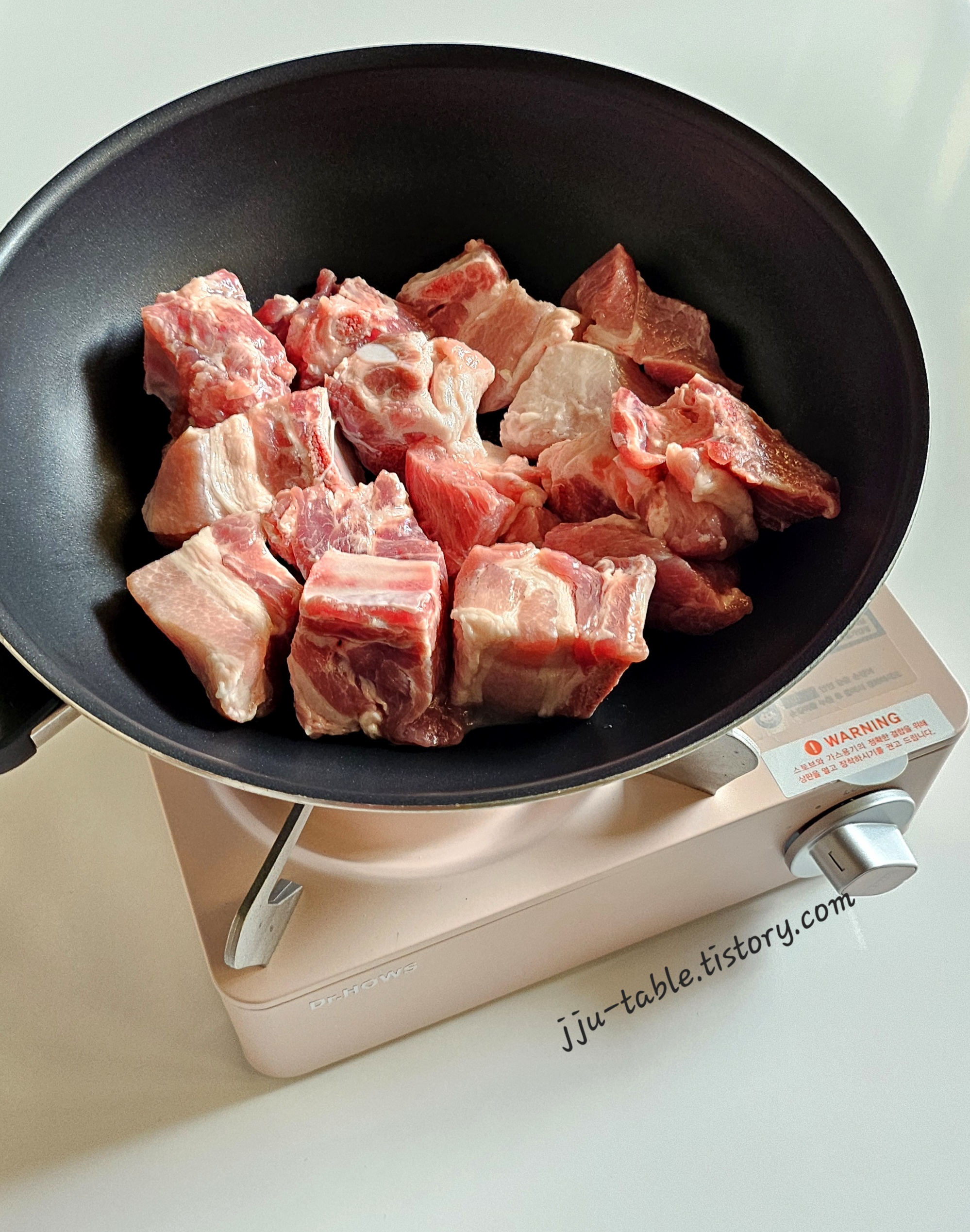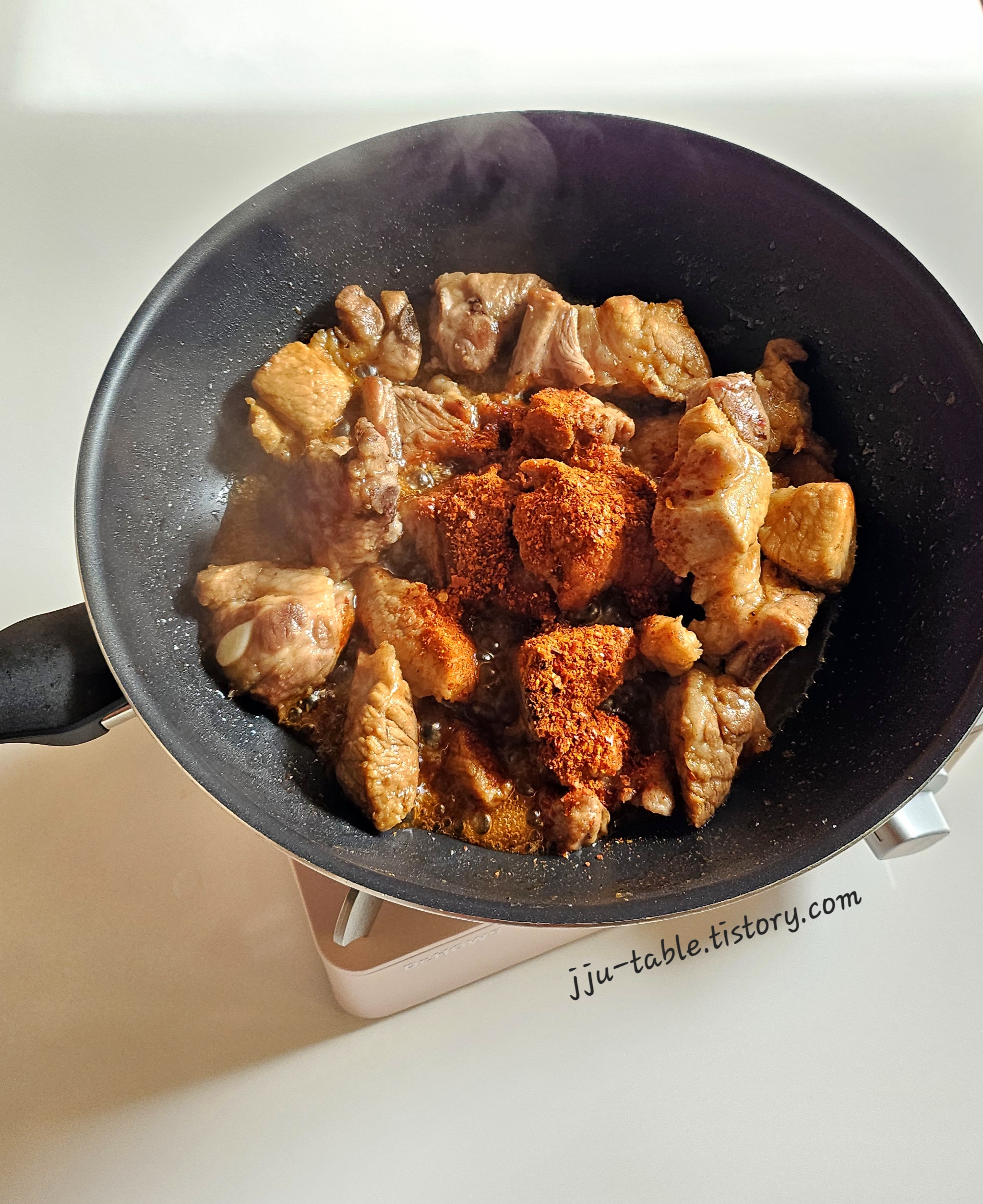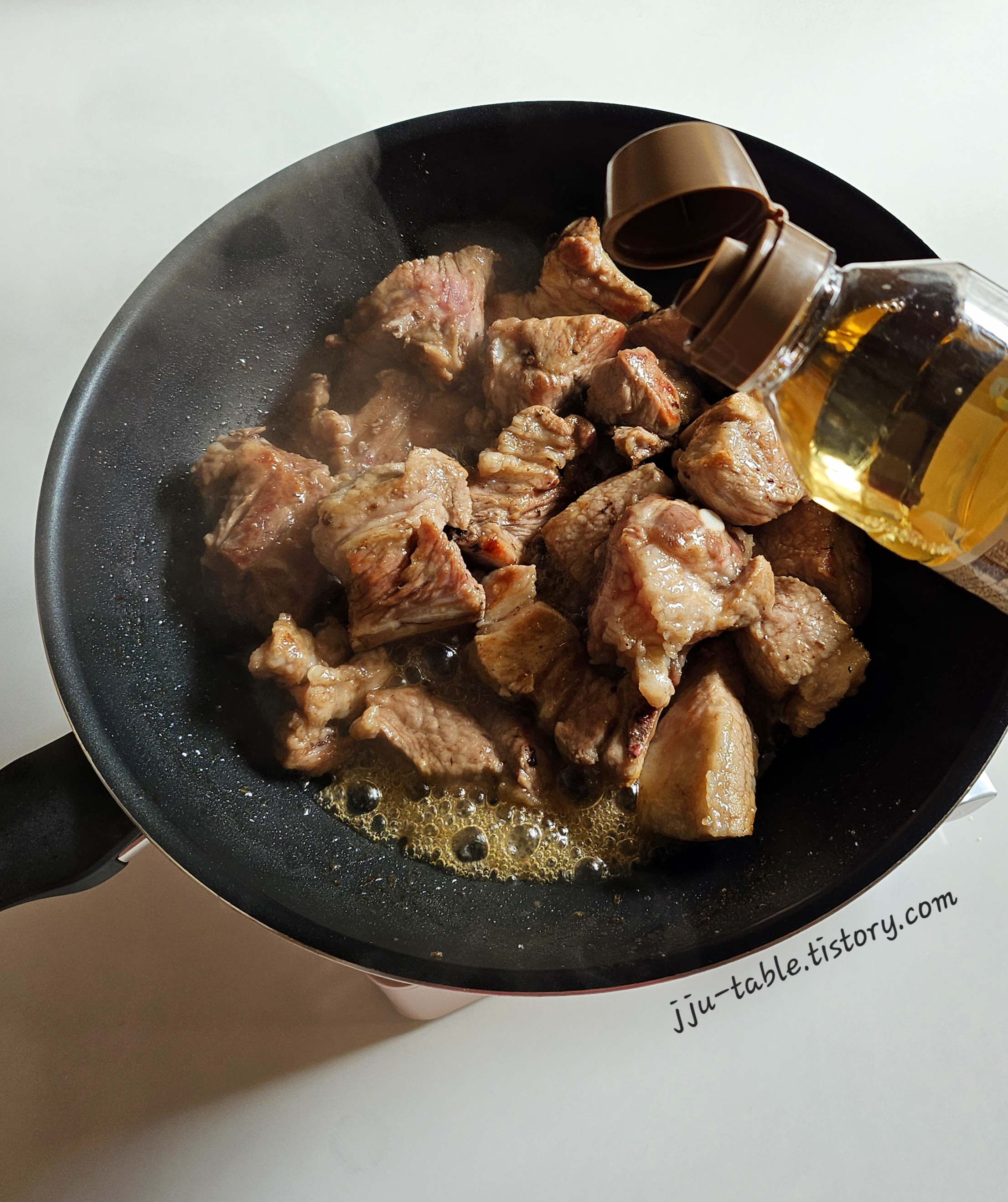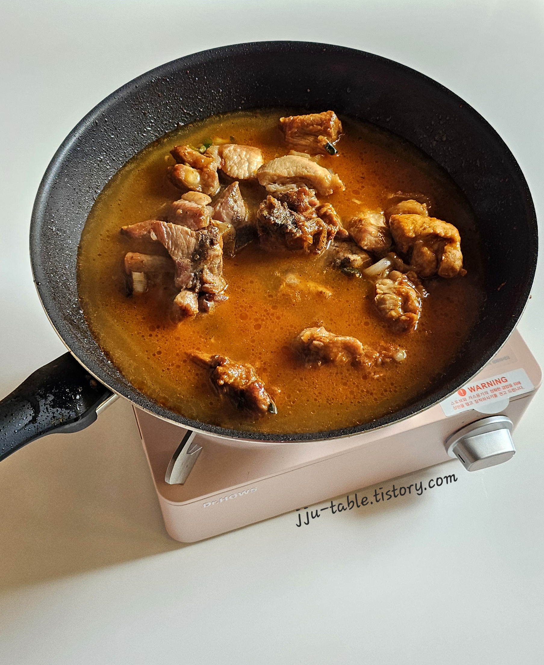 류수영 돼지갈비찜 케첩 2스푼 넣기 - 고기가 자작하게 잠길 정도로 물 500ml 넣고 후추 20바퀴를 넣어주세요. 저는 숟가락 기준으로 1/2 스푼 정도 넣었어요. 물이 끓으면 뚜껑을 닫고 약불로 40분 끓여주세요.