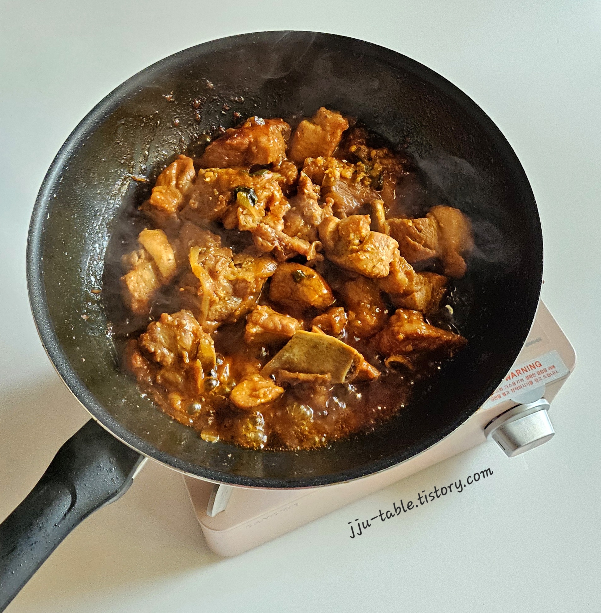 물 500ml, 후추 넣기 - 40분 후 강불로 물이 날아가서 토마토소스처럼 걸쭉해질 정도로 5분간 볶아주세요.