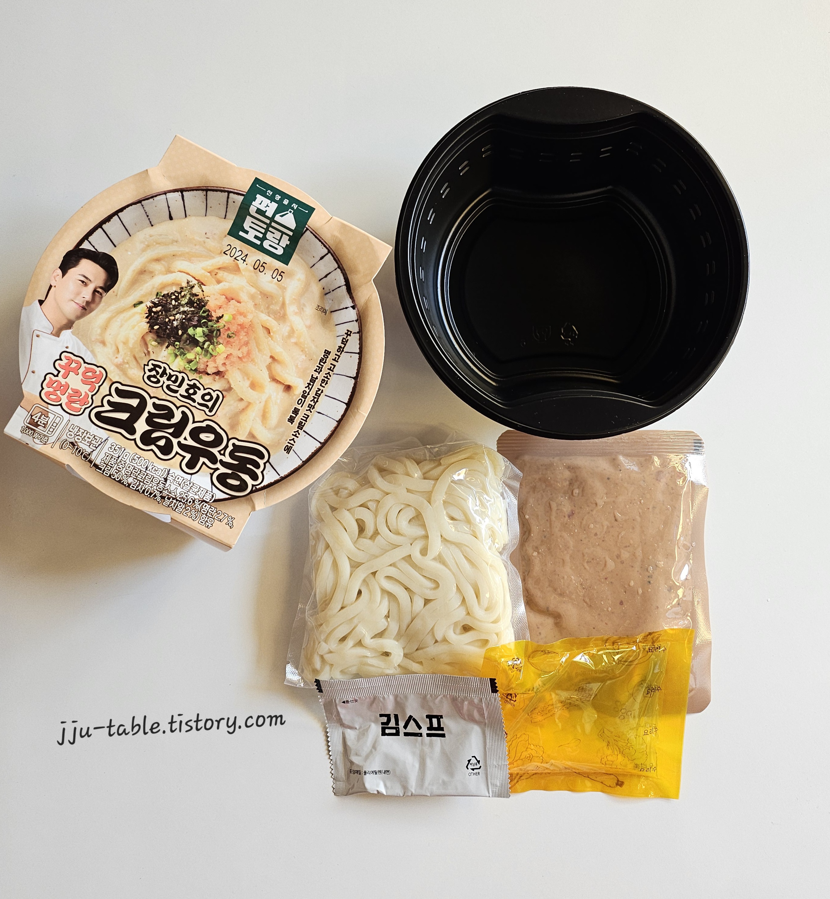 장민호 꾸덕크림 크림우동 구성 포장지를 뜯고 종이케이스를 빼면 면, 요리수, 소스, 김수프가 들어가 있어요.