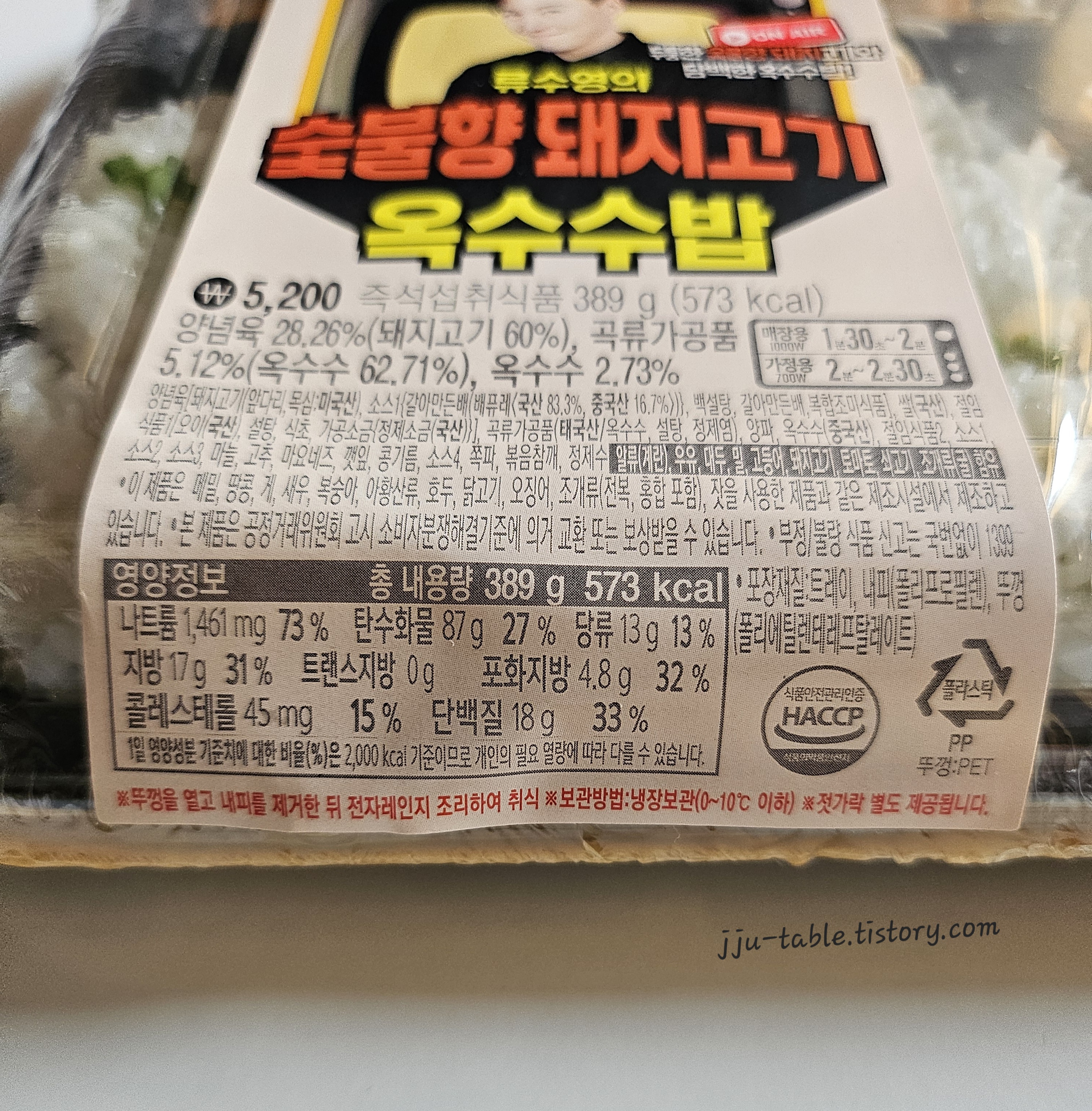 류수영 숯불향 돼지고기 옥수수 밥 류수영 숯불향 돼지고기 옥수수 밥 도시락 뚜껑을 열면 옥수수밥, 돼지고기, 오이 무침, 콘옥수수와 마늘과 고추가 들어가 있어요. 편의점에서 들고 오면서 조금 흔들렸는지 반찬이 조금씩 섞였네요. 2분~2분 30초 정도 전자레인지에 데워서 드시면 됩니다.