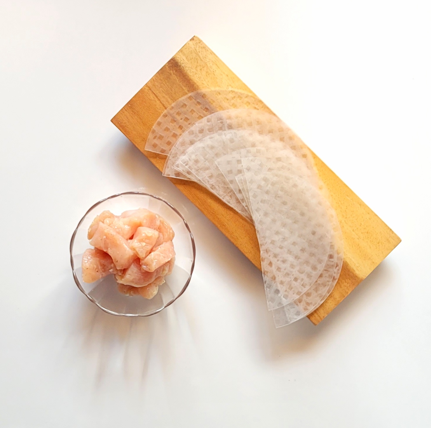 밑간 한 닭가슴살과 라이스페이퍼 - 밑간 한 닭가슴살과 라이스페이퍼를 준비해주세요. 라이스페이퍼는 반으로 잘라서 하셔도 되고 닭가슴살이 조금 크면 한 장을 다 사용하셔도 될 것 같아요. 저는 반으로 잘라서 했습니다.