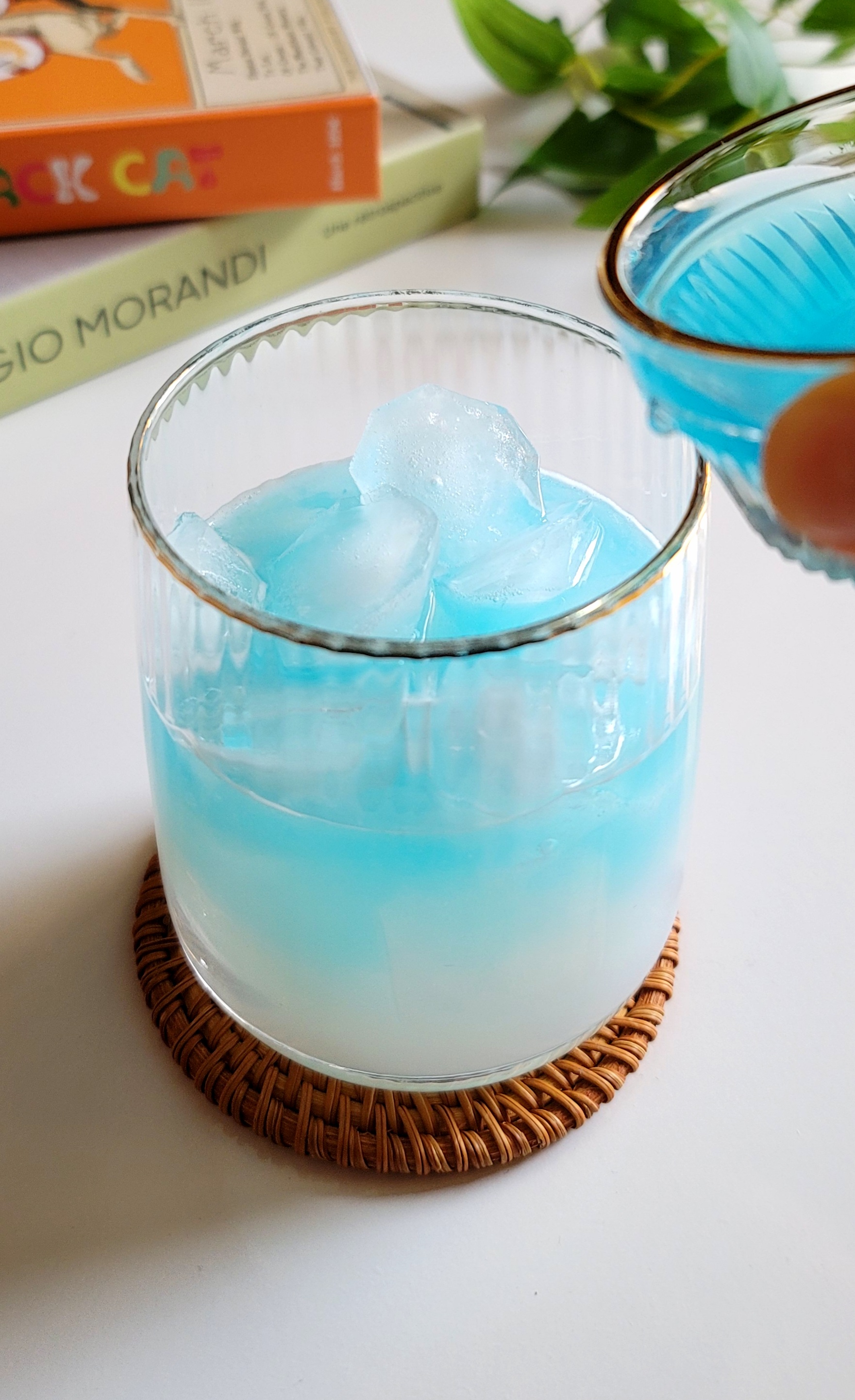 얼음 넣기 - 얼음을 넣고 나서 블루 레몬에이드를 밀키스와 1:1 비율로 넣어주세요. 밀키스와 같은 양 100ml 넣었어요. 여기서 포인트는 블루 레몬에이드를 천천히 부으셔야지 층이 생겨서 예쁜 구름 에이드가 완성이 돼요.