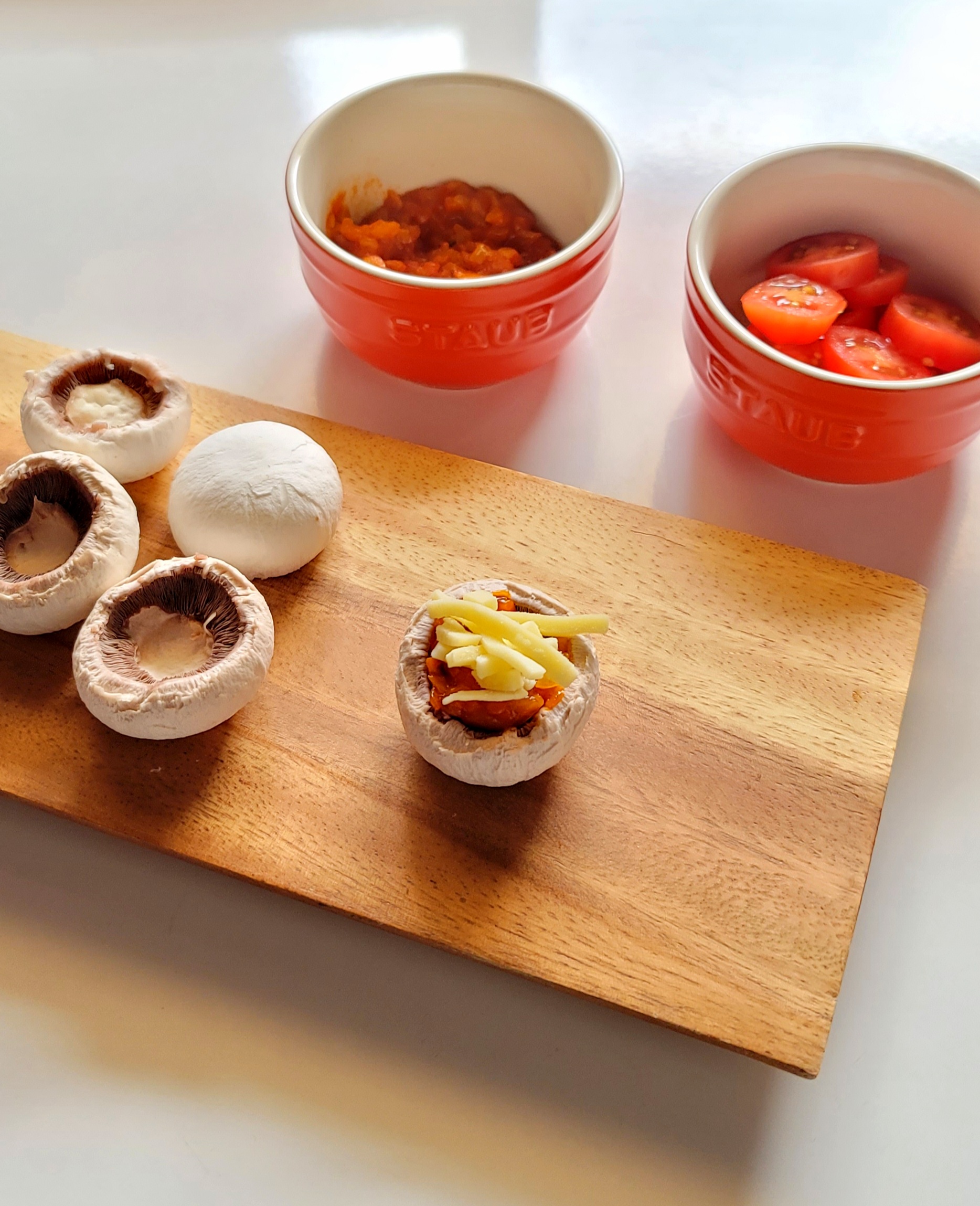 방울 토마토 올리기 - 양송이버섯에 볶은 채소에 치즈 올리고 방울토마토 올린 모습이에요.